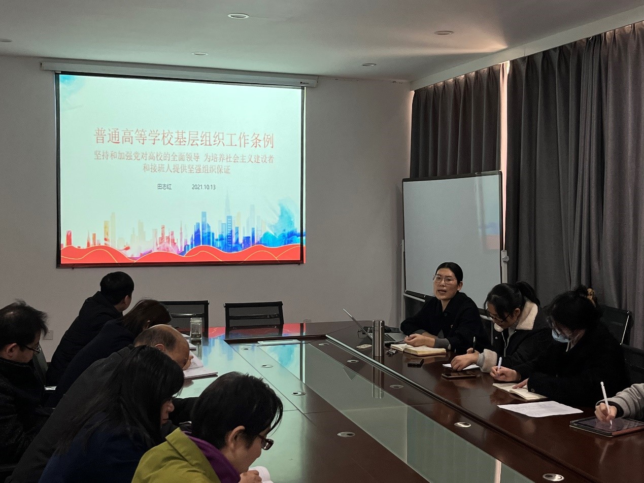田志红首先带领大家学习《中国共产党普通高等学校基层组织工作条例》,重点对《条例》规定的教工党支部和学生党支部主要职责进行了详细解读,要求各党支部要按《条例》规定,认真组织学习和贯彻落实。随后,田志红传达了校党委书记王洪彬在党建工作推进会上的讲话精神、学校第三季度意识形态工作协调联动会议和安全稳定工作会议相关要求,通报了学院党建“双创”工作进展情况和各党支部在自身组织建设、党员教育管理、促进所在系室事业发展、加强学生思想政治引领等方面存在的问题与不足,并对学院12月份党建重点工作进行了安排部署。