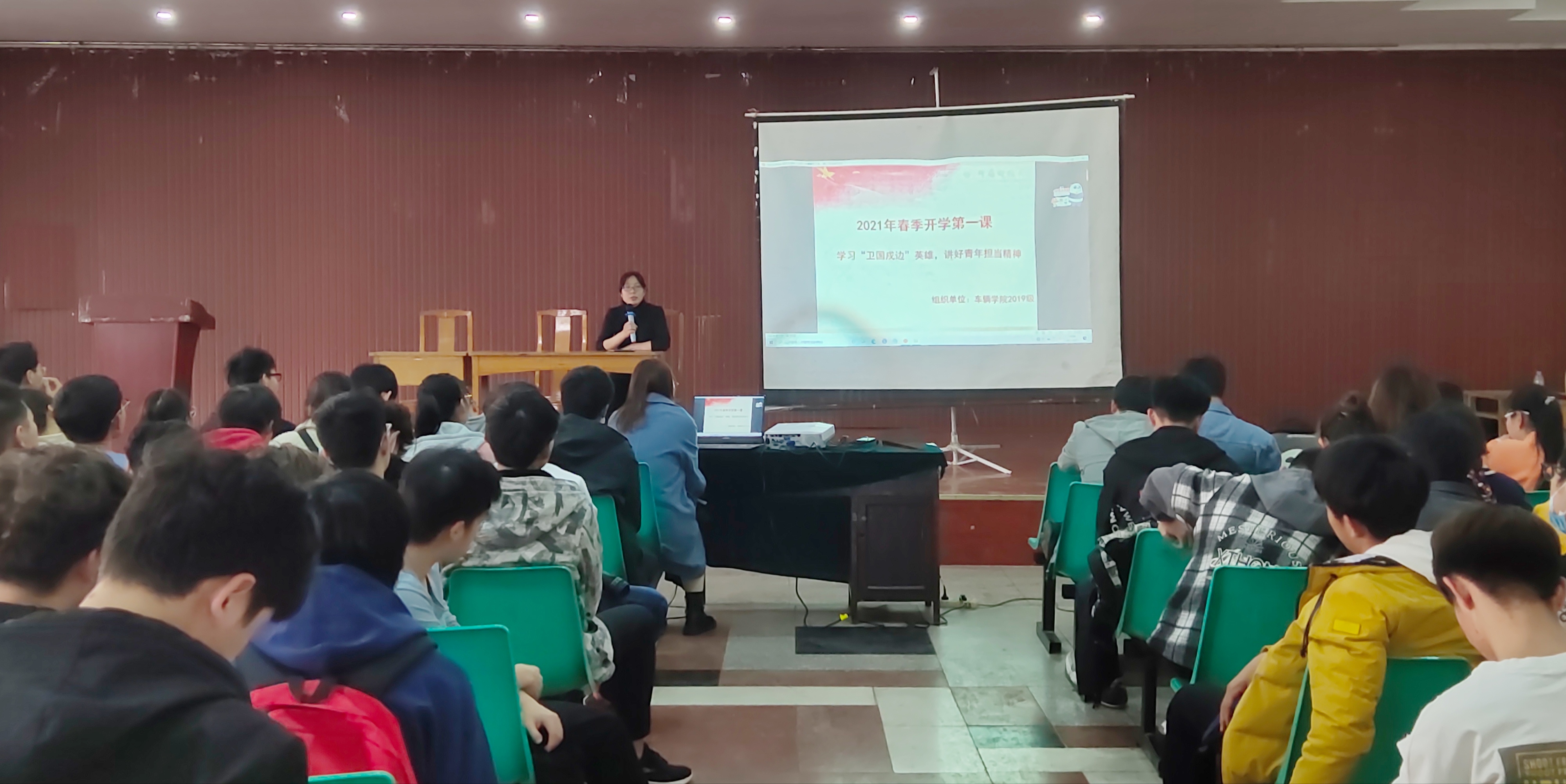 2019级全体师生在西苑校区大学生活动中心以“卫国戍边”英雄责任担当行为为案例,组织开展了《2021年春季开学第一课》的学习活动。