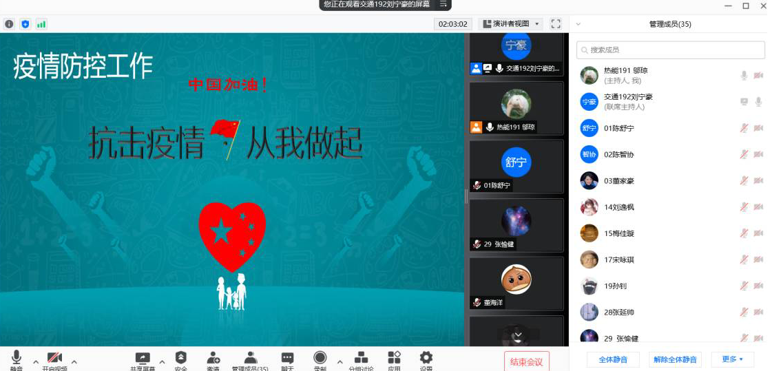 于线上举办疫情防控主题班会。本次主题班会各班班长主持,全体学生参加。