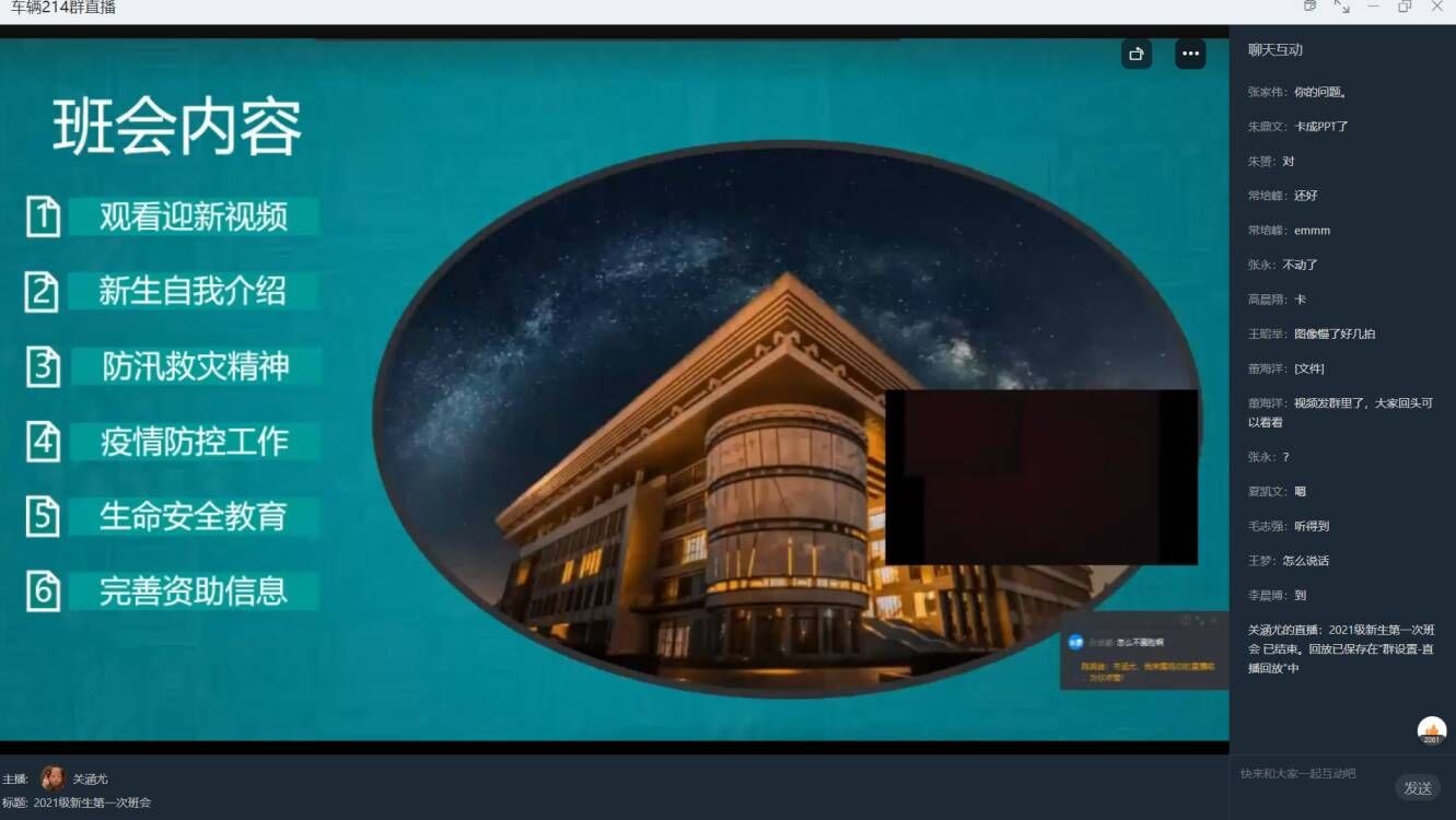 于线上开展了2021级新生主题班会。本次班会的主题为“把灾难当教材,与祖国共成长”,由2021级各班代班长主持,全体2021级新生参与。