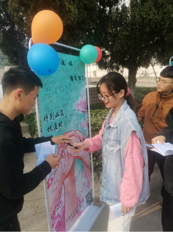 下午2点,心理健康部成员将相关的展板和海报放于大学生活动中心前进行展览。活动开始后,心理健康部成员发放由部门制作的防疫宣传小手册进行,并积极讲解疫情发生以来的重大事件,让参与的同学了解抗疫工作的艰难与医护人员的艰辛。心理健康部成员设置了一系列小问题来提问参与的同学,以答题环节来激起同学们对疫情的认识和思考,同时还对抗疫的一些事迹进行了讲解,抗疫工作者坚强奋斗,顽强拼搏的精神给参加活动的同学留下了极大的触动。最后,进行签名留念环节。参与同学在活动相关的海报上进行了现场签名,并领取了由心理健康部制作的纪念明信片。同学们积极参与其中,反响热烈。