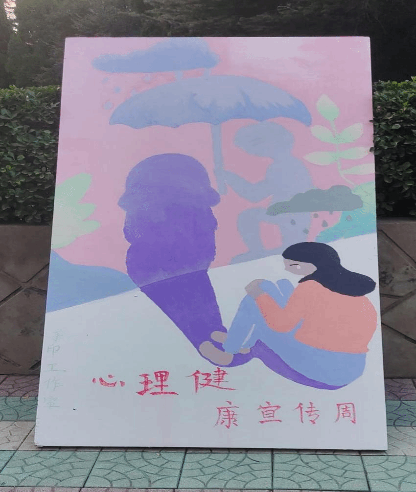 先锋传媒中心手印工作室制作。板报向同学们展示了在小女孩难过伤心时,小天使默默为小女孩撑起保护伞,并对小女孩给予安慰的画面。精美的板报吸引了许多同学驻足观看。