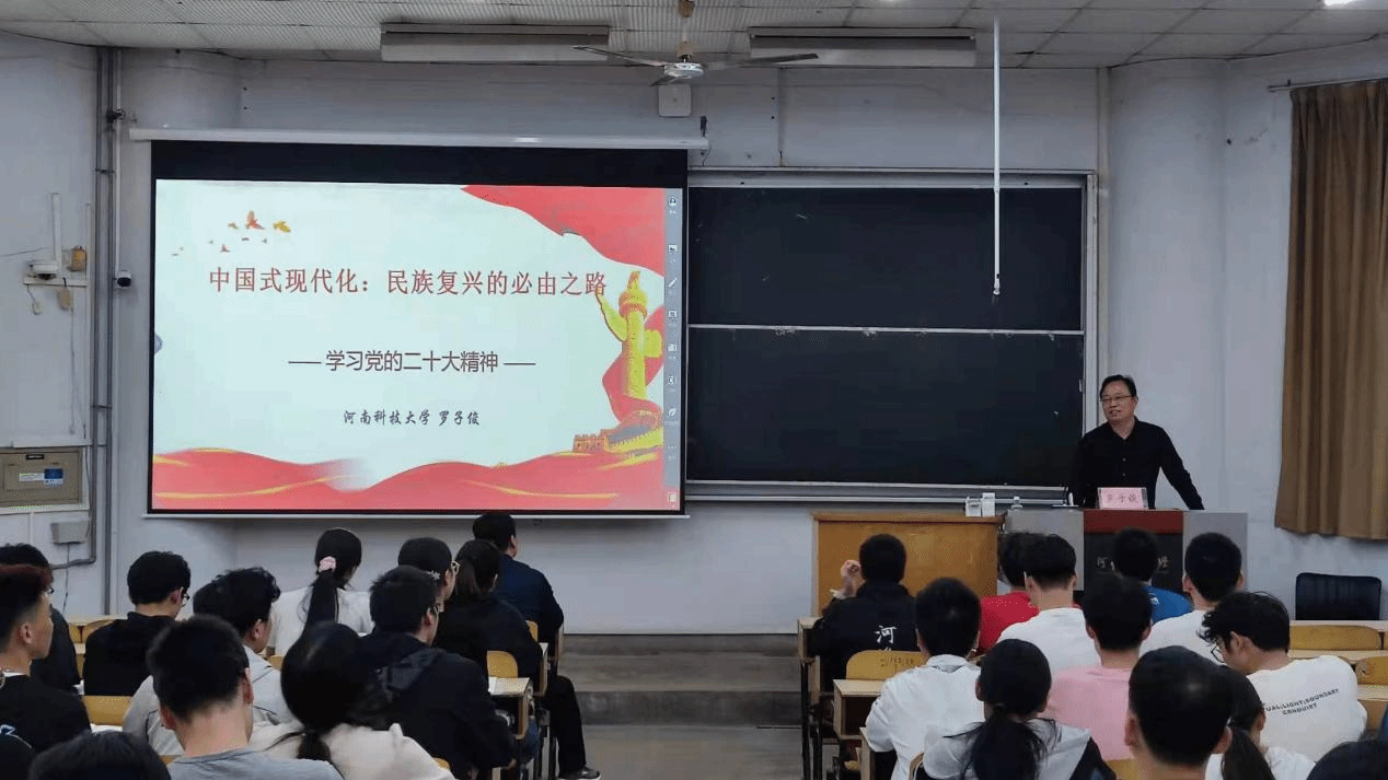 罗子俊首先讲述了党的二十大报告的总体结构、新时代新征程中国共产党的中心任务,然后从中国式现代化的历史逻辑、鲜明特色、本质要求、战略安排、重大原则、世界意义六方面进行全面讲解。他指出,我国当前正处于向第二个百年奋斗的新征程上,中国式现代化具有无比广阔的前景,是实现民族复兴的正确道路。在前进道路上,需要我们每一个人的努力,他呼吁在座的同学,要深刻把握中国式现代化的科学概念和丰富内涵,在新征程上,努力学习科学文化知识,为把我国建设成为一个具有现代农业、现代工业、现代国防和现代科学技术的社会主义强国做出贡献。