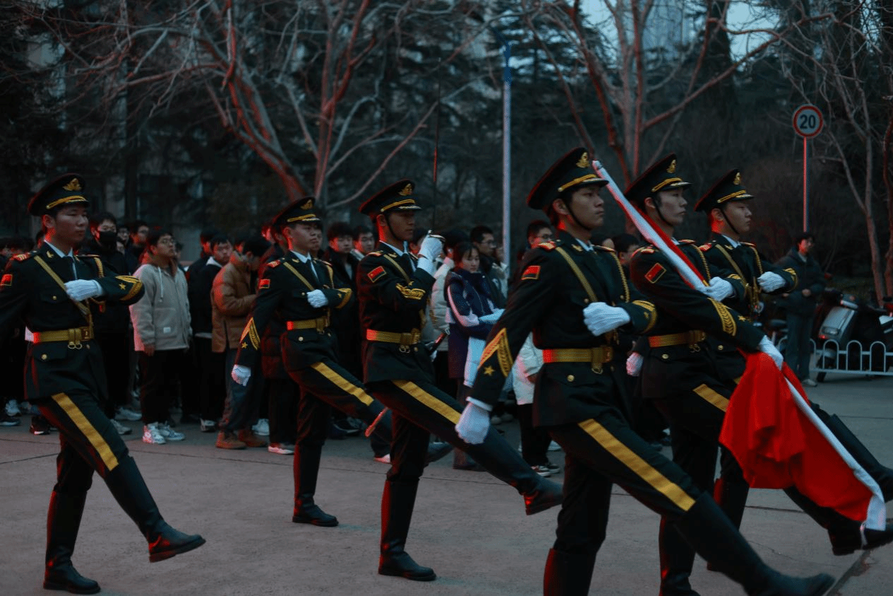 仪式中,英姿飒爽的国旗护卫队队员迈着铿锵有力的步伐护送国旗入场。在庄严雄伟的国歌下,五星红旗冉冉升起,全体人员神情肃穆,站姿笔直,向国旗行注目礼。