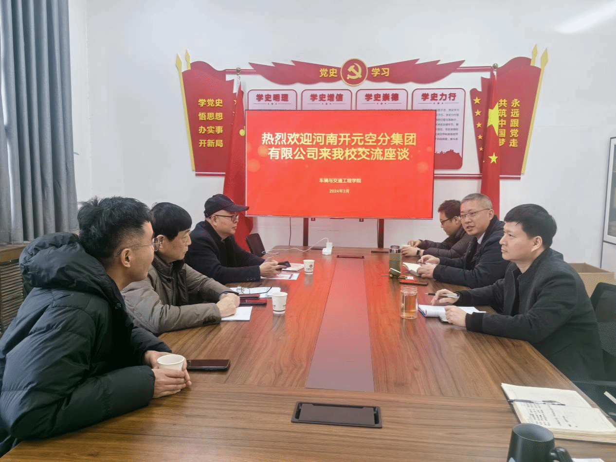 在西苑校区2号楼215会议室举行“访企拓岗促就业”座谈会。河南开元空分集团有限公司董事长助力张昀卿、技术总监张冰、副总工程师刘代勇,车辆学院党委副书记陈建峰、团委书记索榕、制冷教研室主任芮胜军和董彬参加座谈会。