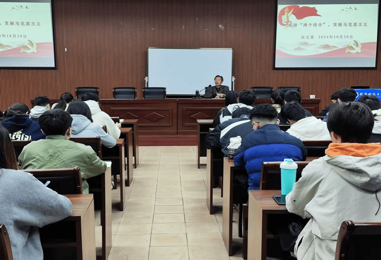 在西苑校区6号楼101会议室举办“坚持‘两个结合’,发展马克思主义”专题讲座。本次讲座特邀学院原党委书记、现校关工委宣讲团成员任义勇主讲,学院团委副书记李艳红主持,第44期全体入党积极分子参加。
