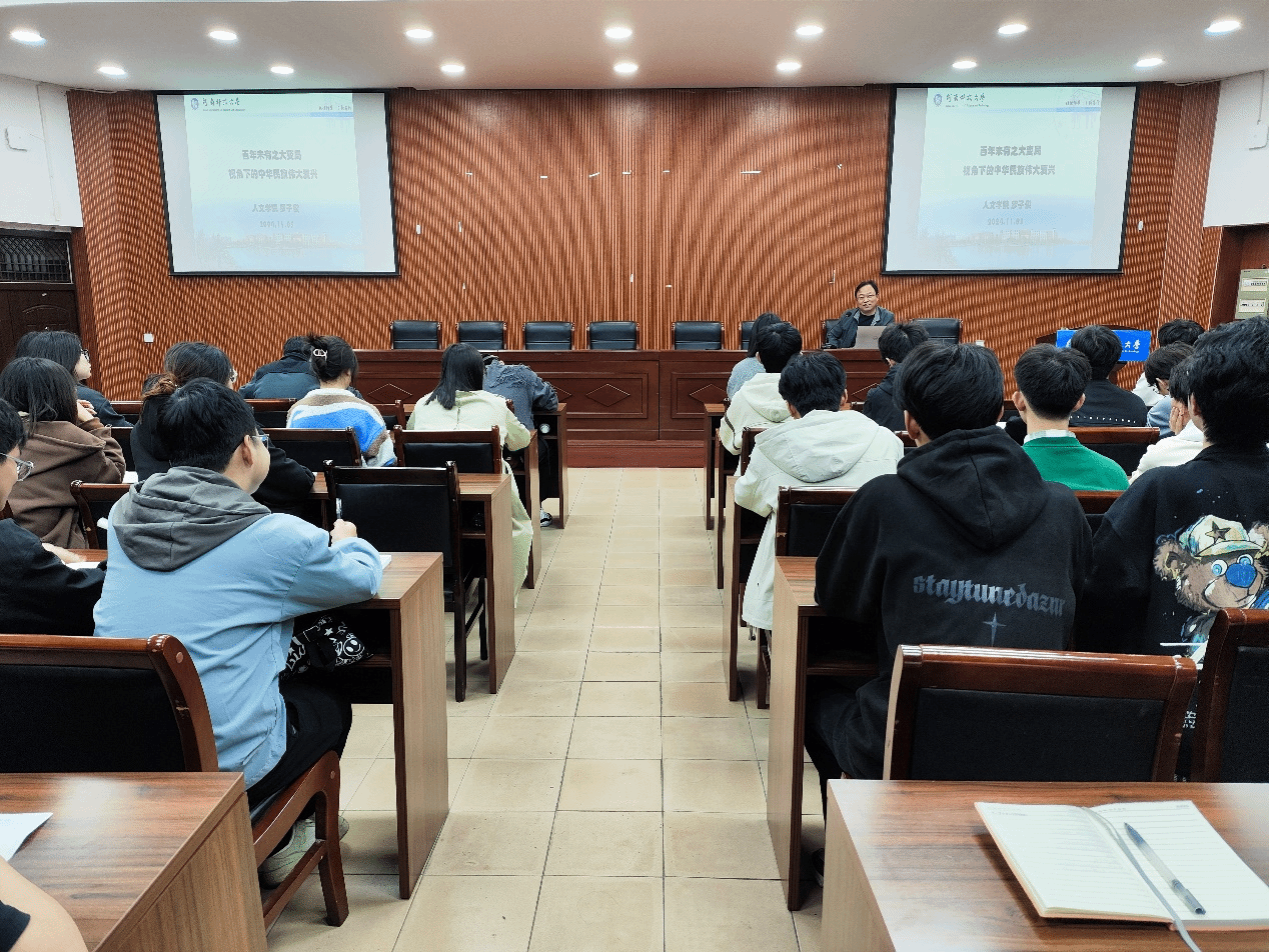 在西苑校区6号楼101室举办“百年未有之大变局与中华民族伟大复兴”专题讲座。本次讲座特邀人文学院院长罗子俊教授主讲,学院党建工作科科长李艳红主持,第44期全体入党积极分子参加。