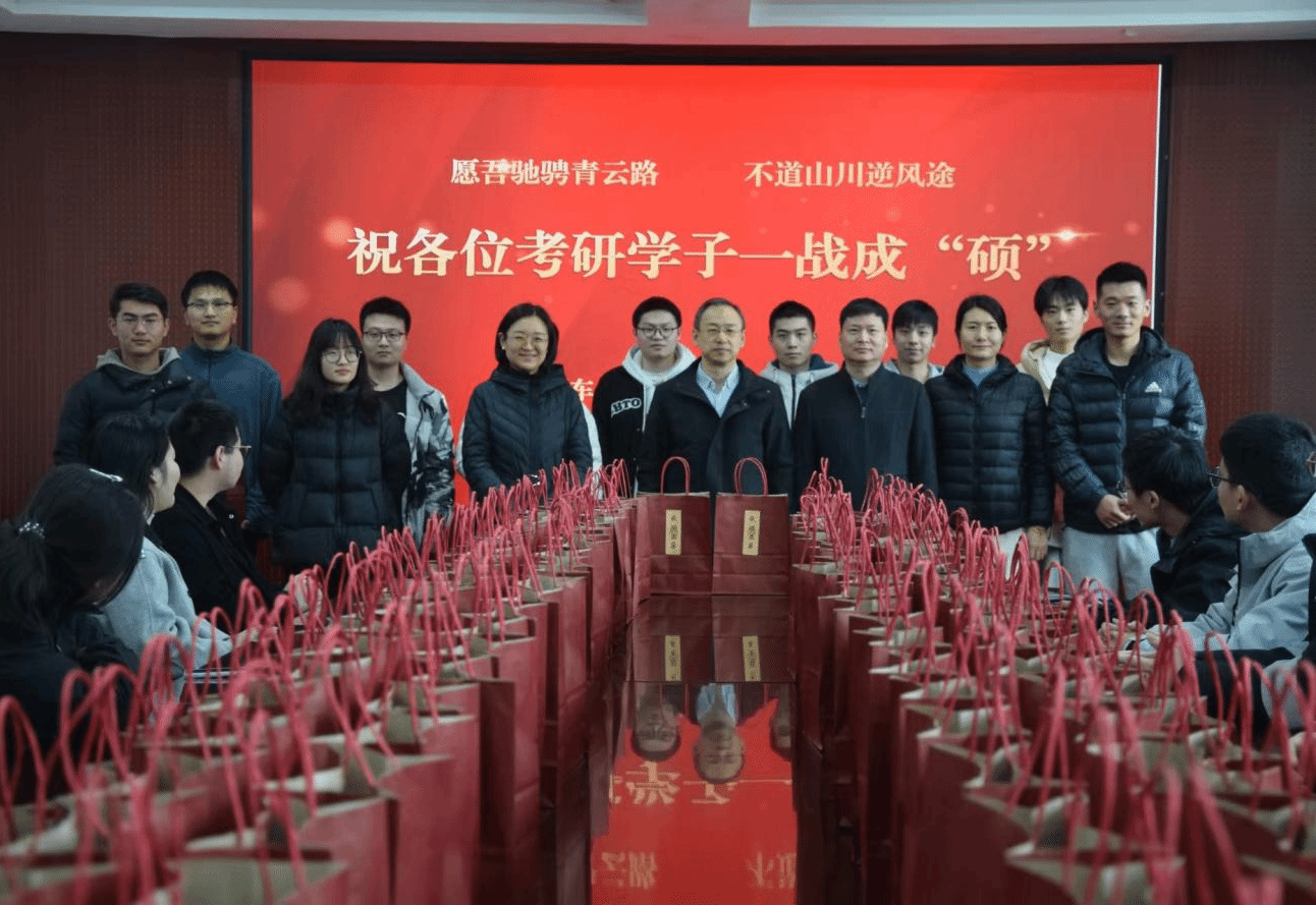 冯飞代表学院对全体考研学子表达关心和慰问,肯定同学们一年来的辛苦付出,并勉励大家以“平常心”应对考试,做好考前的充足准备。 随后,董文铮对即将参加硕士研究生招生考试的同学们表达了深切的关心与期望,希望同学们能够发挥出最佳水平,实现自己的学术梦想。最后,老师们为考研学子送出精心准备的考研大礼包,小小的礼物蕴含着学院师生对考研学子们一战成“硕”的美好祝愿。