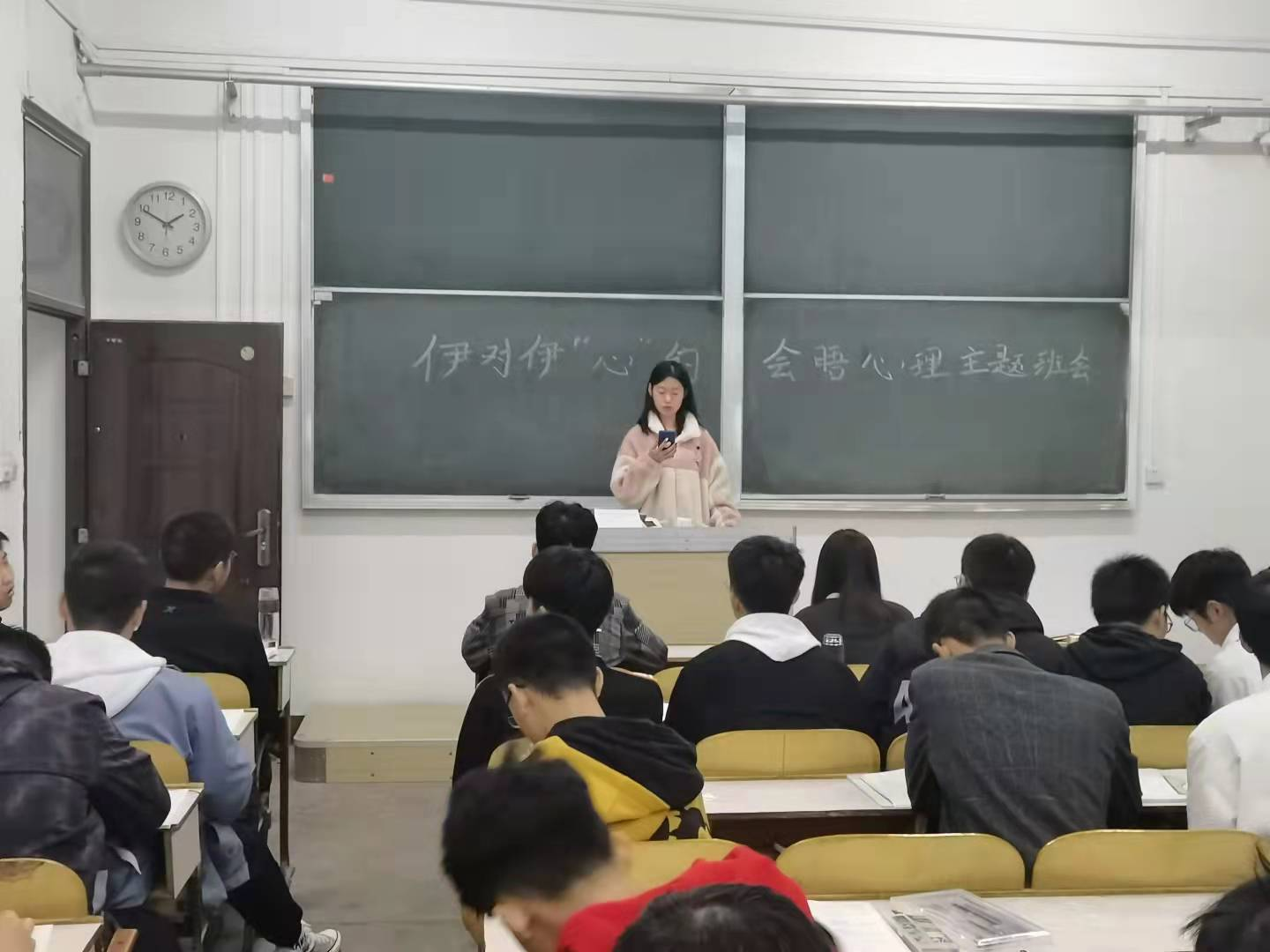 组织2021级新生在各班自习室开展伊对伊“心”的会晤心理主题班会。班会由代班长主持。