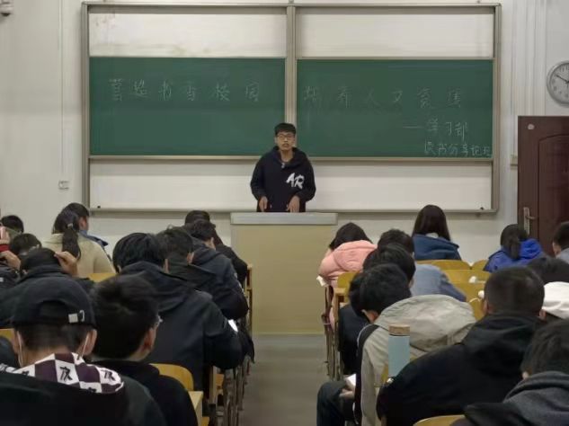 在2021级各班自习室开展了主题为“营造书香校园,培养人文氛围”的读书月进班宣讲活动。院学生会学习部部长董海洋和十名学习部成员组成宣讲团在各班进行宣讲。