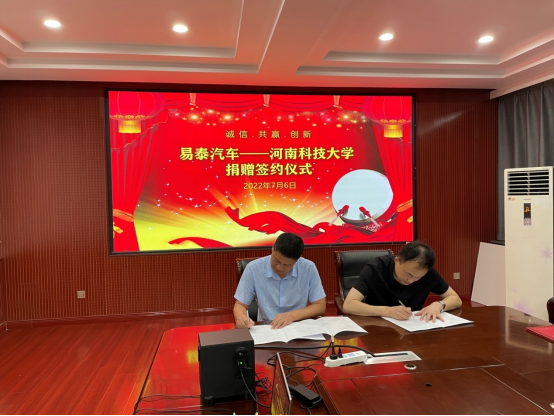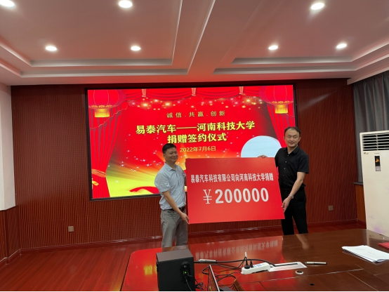 捐赠20万签约仪式在西苑校区2号楼225会议室举行。易泰汽车科技有限公司总经理高兢、副总经理戴晨洁、洛阳分公司总经理陈皓,ace动漫