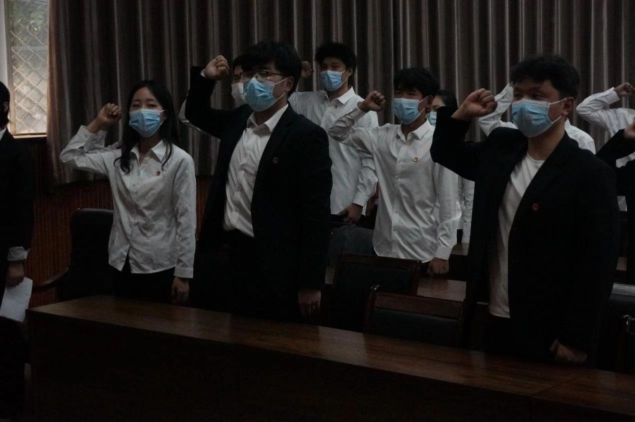 李艳红宣布了新团员名单,领导老师们为新团员颁发团章、团员证并佩戴团徽。全体新、老团员在团委学生兼职第一副书记袁珍珠的带领下向着团旗庄严宣誓。